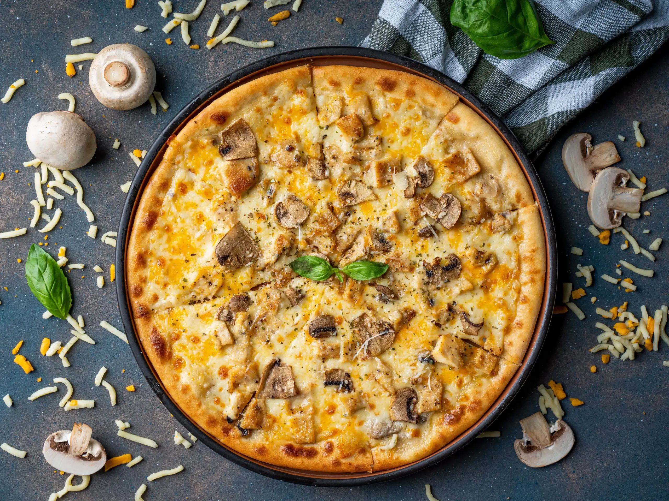 الفطر المقطع والدجاج المشوي الطري.
